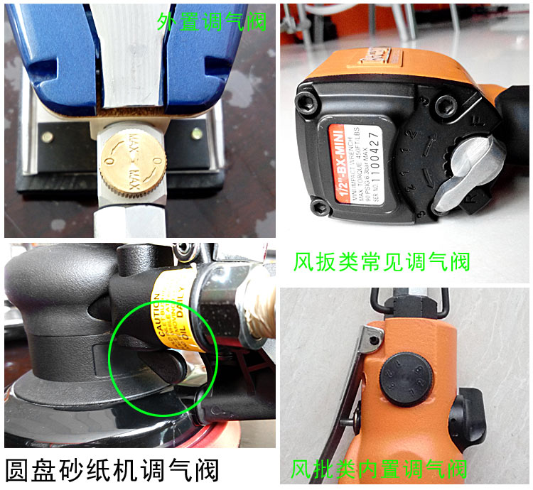 一般情況下,氣動工具產品都自帶有調檔開關,或配備加裝的調氣閥,這些都是調整工具轉速的直觀部件。如下圖: