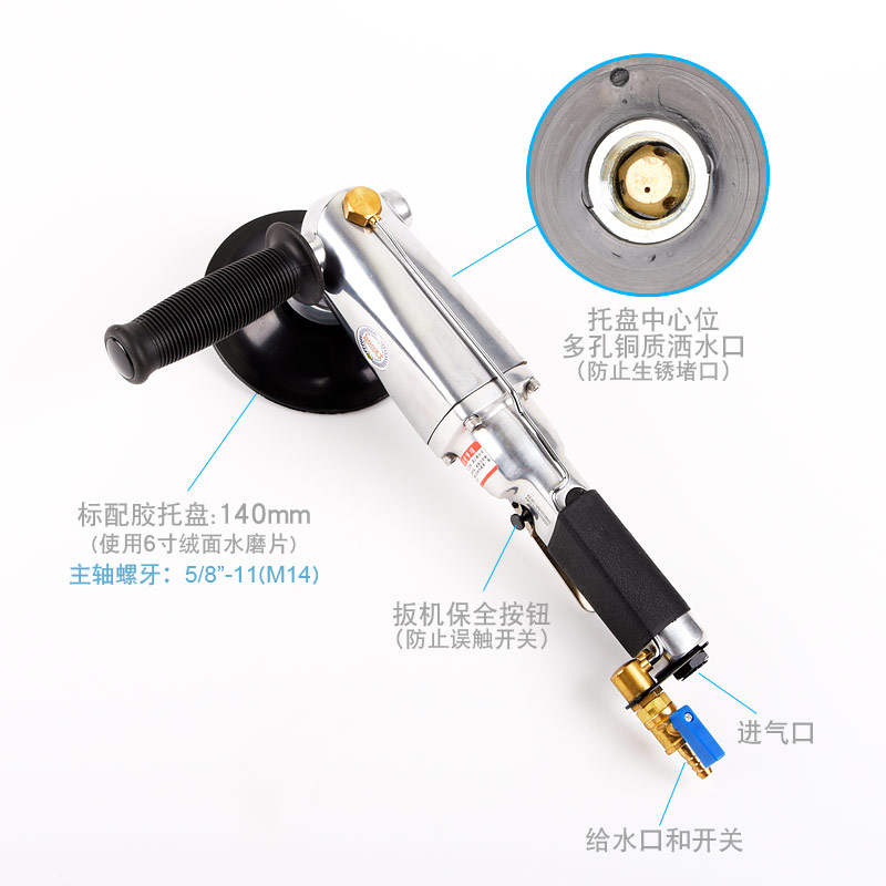 • 產品參數: 托盤尺寸:140mm(M14螺牙);使用磨片:140mm或150mm;轉速:7000rpm;長度:430mm;重量:3.2kg;功率:0.93hp;耗氣量:1.15立方米/分鐘;使用工作氣壓:0.63Mpa;推薦氣管內徑13mm;平時使用應多加氣動油保養