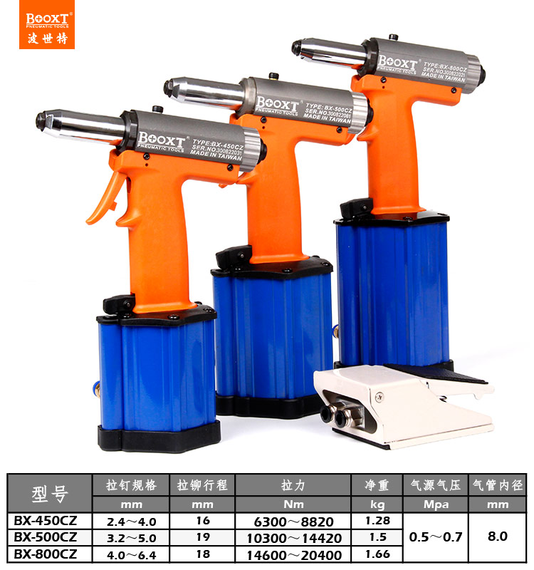 東莞市強勁五金工具有限公司提供臺灣BOOXT波世特品牌氣動工具,腳踏開關氣動拉釘槍BX-500CZ廠家直銷,首件享特價。咨詢熱線:4008301980