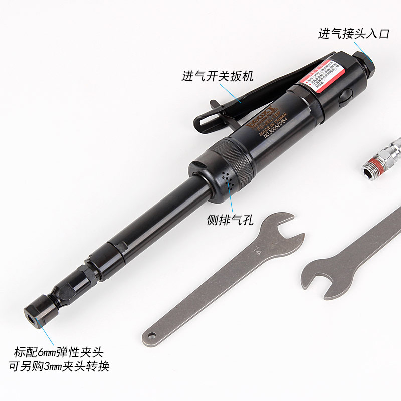 • 產(chǎn)品參數(shù): 夾頭尺寸:3,6mm;(標(biāo)配M6) 空載轉(zhuǎn)速:24000rpm; 馬達(dá)功率:0.32HP 總 長(zhǎng) 度:308mm 桿 直 徑:19mm 桿 長(zhǎng) 度:150mm 重 量:1.0kg; 側(cè)排氣; 耗氣量:2.8cfm/分鐘; 使用工作氣壓:0.65Mpa; 推薦使用內(nèi)徑8mm氣管; 平時(shí)使用應(yīng)多加氣動(dòng)油保養(yǎng) 【扳機(jī)式開(kāi)關(guān)】