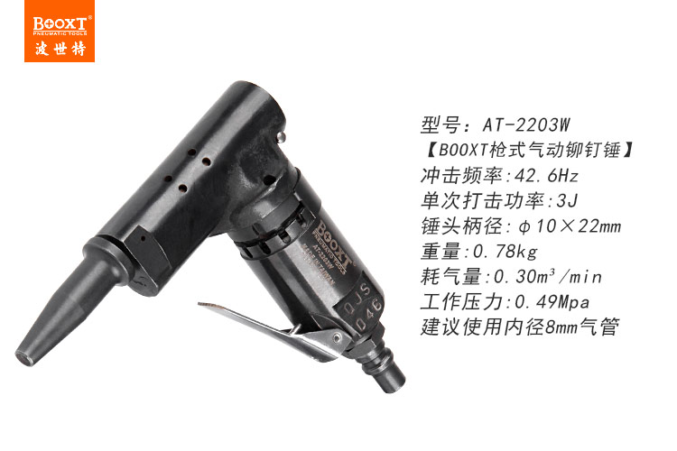 • 產(chǎn)品參數(shù): 鉚 釘 頭:10*22mm 鉚釘能力:3mm 單次沖擊功率:3J 沖擊頻率:42.6HZ 耗 氣 量:0.3M3/min 長 度:135mm 重 量:0.78kg。【工業(yè)型/彎頭式】