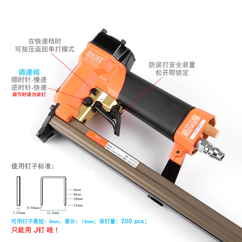 • 產品參數: 特點:可調節快速連打,自帶防誤打安全開關;釘子寬度:11.2mm;釘子跨度:10mm;釘腳尺寸:0.58×1.15mm;使用釘子長度范圍:6-13mm;裝釘量:200個;使用工作氣壓:0.6Mpa;推薦使用內徑6.5mm氣管;平時多注意定時排放空壓機水份